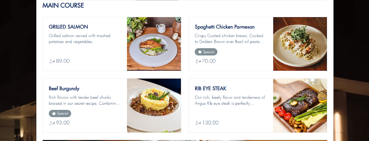 For those with a taste for indulgence, the main courses such as the Rib Eye Steak (AED 130) promise rich flavors and tender meat, served alongside fresh grilled vegetables and creamy mashed potatoes. The Grilled Salmon, accompanied by vegetables and mashed potatoes for AED 89, is equally impressive, making LUDUS CAFE a fantastic choice for a leisurely lunch or dinner.